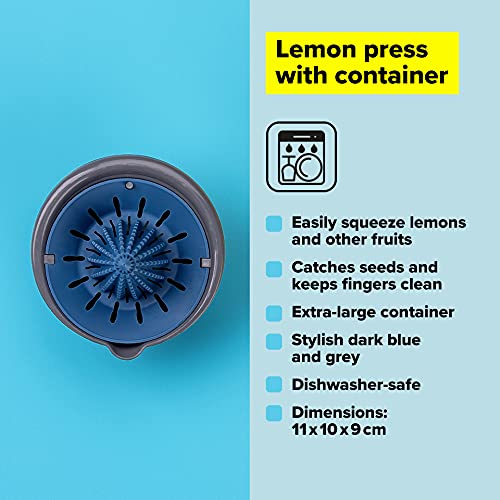 • Tasty Citrus Press with Container, Manual Juicer for Citrus Fruits, Lemon Juicer Squeezer with Seed Filter, Hand Juice Presser, Dimensions: 11 x 10 x 9 cm approx. 2 Lemons, Colours: Blue and Grey