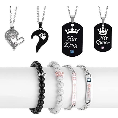 • Yolev 8 Pieces Couple Necklace Bracelet Set, I Love You Pendant Necklaces,Her King&His Queen Necklace Bracelet, Crown Necklace for Valentine's Day Anniversary